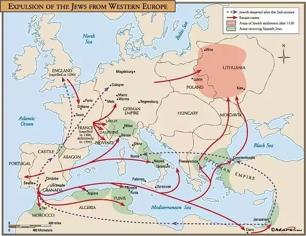 后来,这些人身侮辱继而转变成为物理空间上的种族隔离和驱逐。1290年,犹太人被爱德华一世(Edward I)驱逐出英国,直到17世纪中叶才有犹太人返回英国。此后的几十年里,他们也被驱逐出法国和德国的许多城镇。