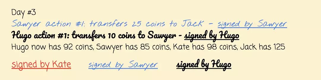 凯特设法在账本上获得了3个签名,每个签名都确保了余额确实与今天的转账和昨天的余额相符。多数人的签名在列,这个账本也就被承认是最终的版本。
