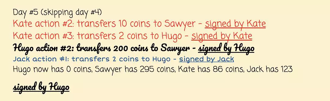 即便他的转账不对劲,雨果仍然对这条更新签了名。为了使这条更新得到通过,他还需要收集另外2个签名。当他走到索耶和凯特那,他们注意到上一个的资产负债表上(从第三天开始),雨果有92枚硬币,他怎么能转给索耶200枚?他们拒绝签字,直到他修正这个错误,并删除这条无效转账。雨果不情愿地同意并公布了一份正确的新资产负债表,他们最终签署了这份协议: