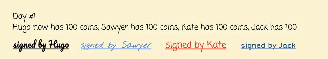 这张纸是我们第一次达成的一致意见,也是为什么它被标记为第一天。余额是从哪来的?我们之前已经达成共识,一开始每人100个硬币是公平的。我们还需要有人来写这张纸
