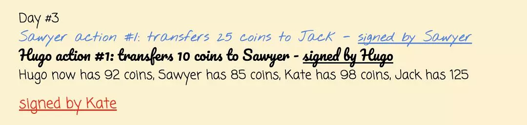索耶记的账本并不是最终的,因为它只有索耶的签名,他还需要更多签名。索耶要求每个人核实并签字。账本很容易核实,验证者可以先查看下他自己手头的文件,并找到前一天(即第一天)的记录。接下来,验证者需要重新检查新的转账。我们只有一个凯特的转账记录,并且很容易验证,我们可以确保它确实是由凯特签名的,也能确保凯特确实有足够的硬币来支付给雨果。