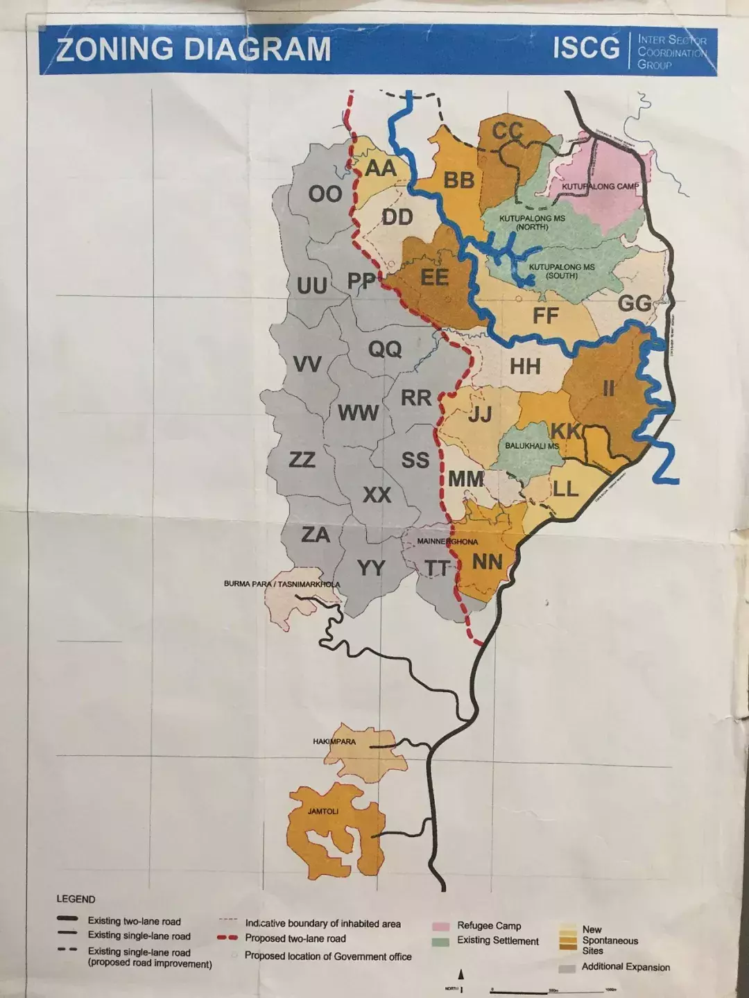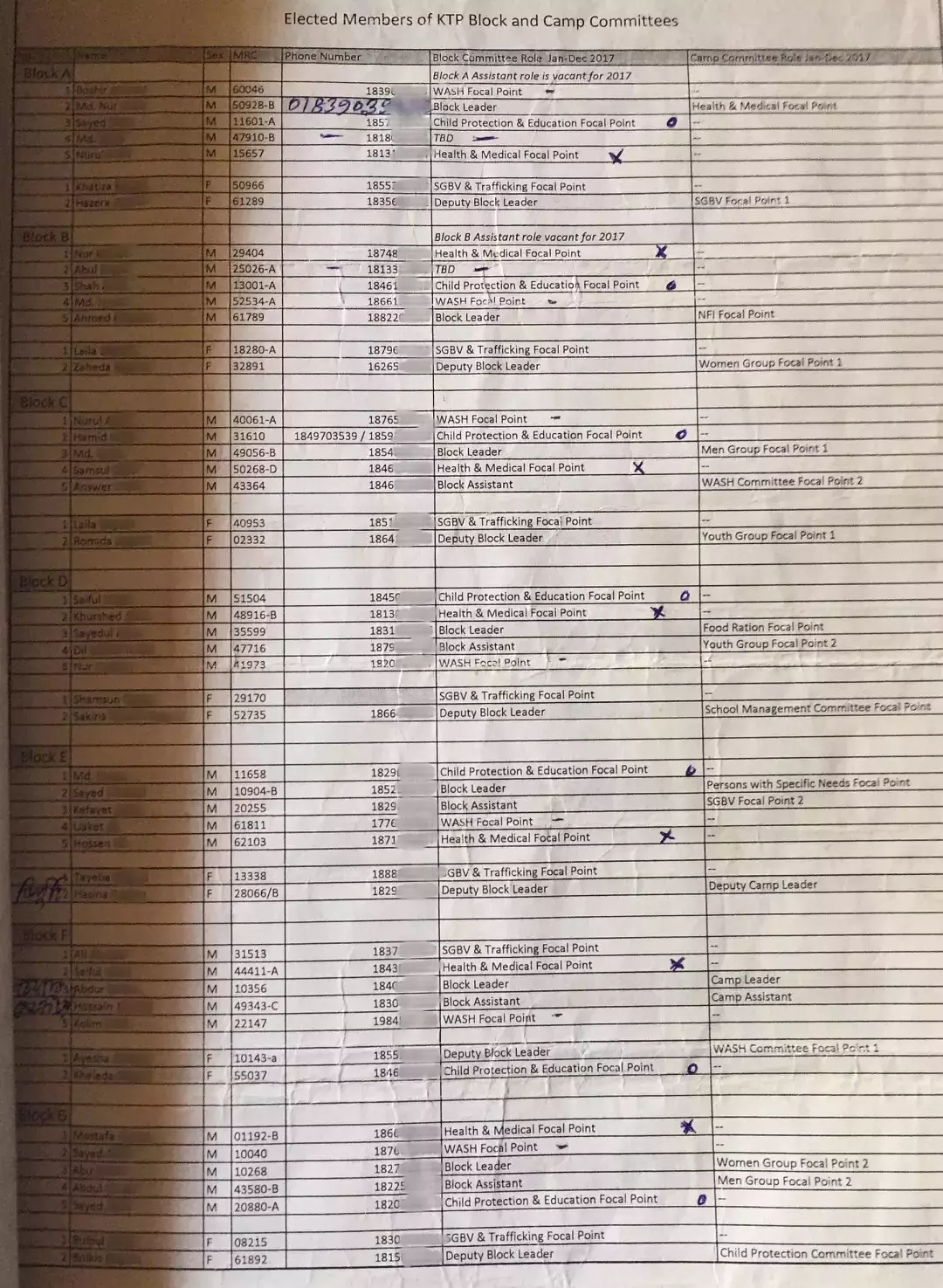 委员会有49名成员,都是库图帕隆的难民,由孟加拉政府和联合国难民署共同选出,每三年选一次。负责管辖的地区(上图粉色部分)被分为7个街区,每街区各7名委员会成员,其中2名女性,5名男性,分管不同的事务,如医疗卫生、教育、食物等。49人中,有3人属于管理层,分别是主席、副主席、秘书长。每逢大事,由他们3人和孟加拉政府以及联合国难民署交流定夺。“他就是我们的秘书长。”穆罕默德用下巴指了指一个穿红色T恤的中年男人。我点头问好,秘书长点头回应,一手撑着脑袋,不停抖腿,不多说话。