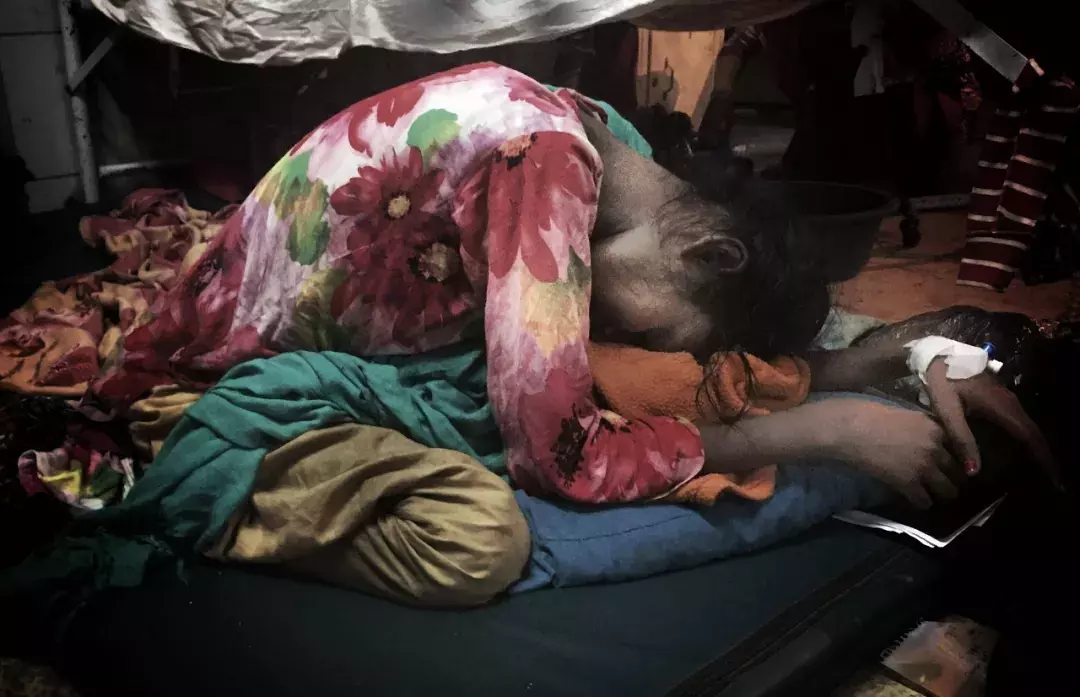 病房里的面孔大多都很麻木。十几岁的女孩躺在病床上,头枕着右手,歪向一边,眼里无神。丈夫低头抱着因病痛而颤抖的妻子,无可奈何,沉默得像一尊雕塑。嚎出声音的人反而是少数——一个老妇人的手被注射点滴的针管扎肿了,再次被扎时,哭得像个孩子,几个人一齐压住她。